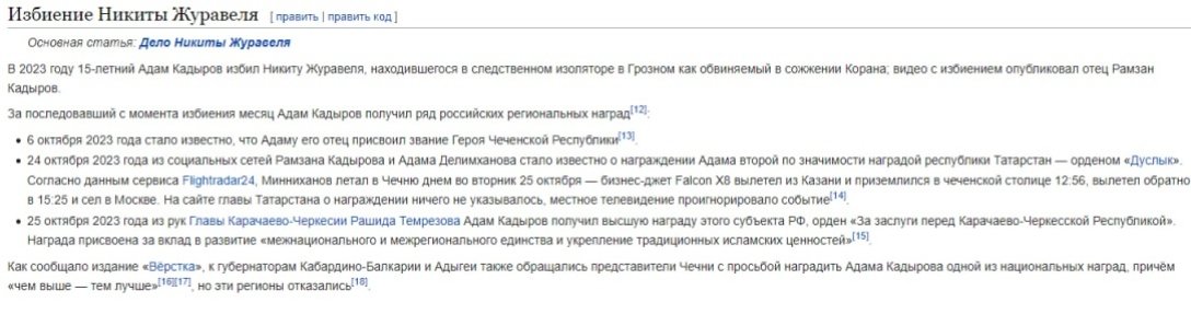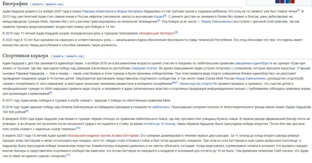 Далее автор в "Википедии" рассказал о развитии спортивной карьеры Кадырова-младшего. В частности, он рассказал, как сын Кадырова одерживал победы на боксерских, кикбоксерских и других турнирах — его соперники падали и не вставали после легких ударов, или вообще почти не атаковали. Или же судьи "отправляли в нокдаун" более сильных соперников.