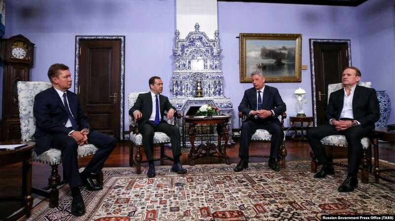 Слева направо: глава "Газпрома" Миллер, премьер россии Медведев, кандидат на пост президента Украины Бойко и глава политсовета ОПЗЖ Медведчук. Москва, 22 марта 2019 года. Фото: "Радио Свобода"