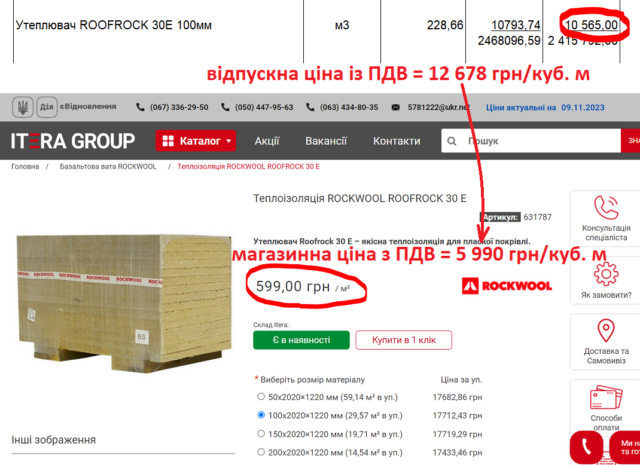 Цена утеплителя Rockwool Monrock Max E толщиной 100 мм на сумму 2,58 млн грн в 11 263 грн/куб. м соответствует рынку. Itera Group предлагает его под заказ по 1 194 грн/кв. м , то есть 11 940 грн/куб. м. Еще 2,79 млн грн уходит на утеплитель Rockwool Frontrock Max Е толщиной 150 мм по 5766 грн/куб. м. Его уже переименовали в Frontrock Super. И цены на рынке разнятся в разы – от 639 грн/кв. м до 2120 грн/кв. м . Это 4 256-14 133 грн/куб. м.