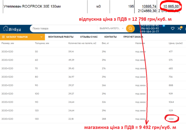 Утеплитель нестандартной толщиной 130 мм учли по 12 798 грн/куб. м. В интернет-магазинах его не удалось найти в наличии, но под заказ его предлагают по 1166 – 1234 грн/кв. м, то есть 8969-9492 грн/куб. м. Это минимум на треть дешевле тендера.