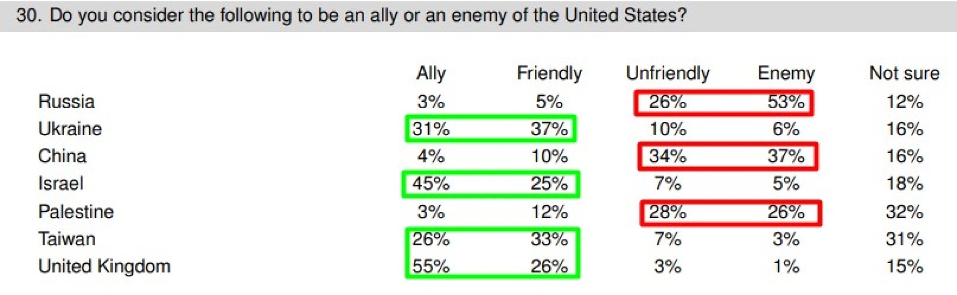 В опросе также интересовались, как американцы относятся к войне РФ против Украины: большинство считает Россию агрессором. Был еще один вопрос — какие страны враждебны или дружественны США. Друзями оказались Украина, Израиль, Тайвань и Великобритания. Враждебными: Россия, Китай, Палестина.