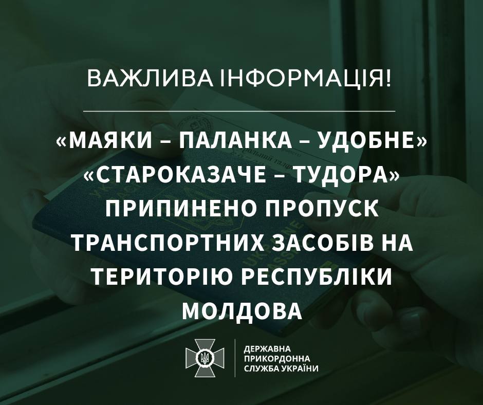 "В связи с погодными условиями в населенном пункте Каушаны (Республика Молдова) загружена трасса. Поэтому молдавская сторона приняла решение о прекращении пропуска транспортных средств на свою территорию в пунктах пропуска "Маяки – Паланка – Удобное", "Староказачье – Тудора", - заявили в Госпогранслужбе Украины.