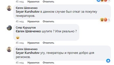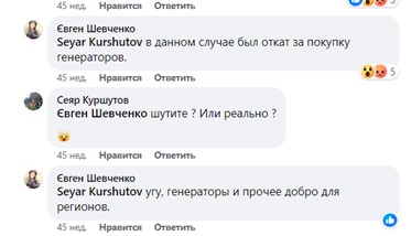 Бывший внештатный агент НАБУ Евгений Шевченко в комментариях под сообщением о задержании Лозинского написал, что «в данном случае это был откат за закупку генераторов в регионы».
