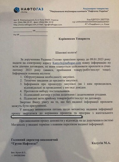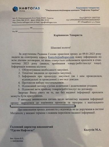 Через несколько месяцев после прихода Чернышева в «Нафтогаз» было обнародовано письмо за подписью главного исполнительного директора НАК Маврикия Калугина. В нем он просил руководителей подчиненных компаний в срок до 9 января 2023 г. предоставить информацию по всем договорам, по которым должны осуществляться проплаты в январе и феврале. Причиной было указано поручение Советника Председателя правления, то есть Александра Сергеева.