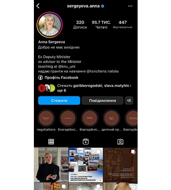 Подтверждений тому, что Анна Сергеева является дочерью советника главы "Нафтогаза" найти не удалось. Ее Инстаграм-страница активно наполняется проектами по благотворительности, помощи военным и даже грантами на обучение. С Днем рождения ее поздравляет ректор КНУ им. Шевченко Виктор Бугров, а подпись в шапке профиля свидетельствует о том, что ей совсем не стыдно за то, что она занимала должность замминистра соцполитики всего шесть недель. Чтобы «галочка» была, как говорится.