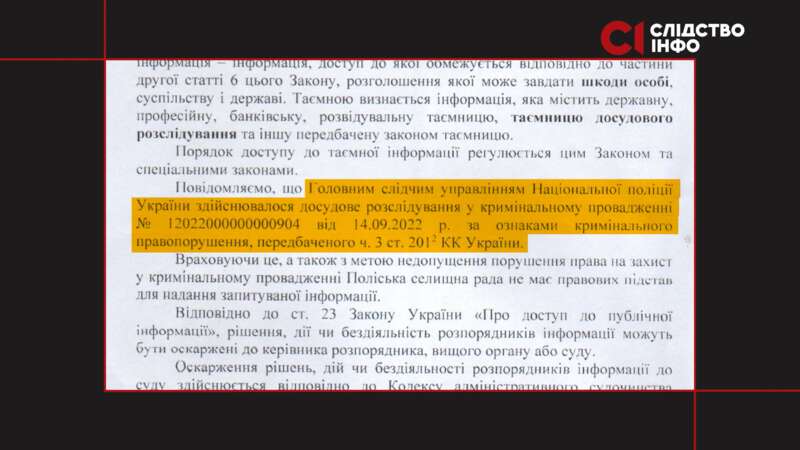 Также «Следство.Инфо» получило ответ от Полесского поселкового совета Киевской области. Совет сообщает, что информацию предоставить не может, потому что это тайна досудебного расследования. Указанная в ответе статья уголовного преступления нарушается при незаконном использовании гуманитарной помощи, чтобы получить прибыль. По данным журналистов, Полесский поссовет не получал помощь.