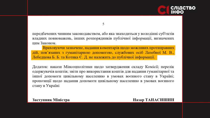 В марте 2022 года Минсоц создает Комиссию по вопросам распределения средств для оказания помощи в условиях военного положения, которая должна была распределить 625 миллионов гривен и контролировать их расход. Сначала Комиссию возглавляет один заместитель тогдашнего министра - Марины Лазебной - Борис Лебедцов, а затем другой - Евгений Котик.