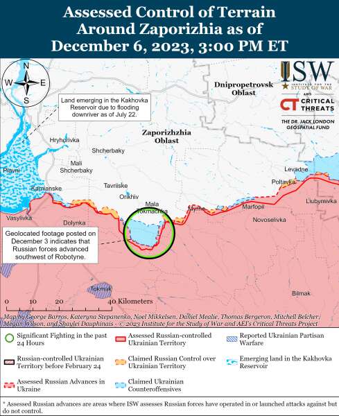 По словам ISW, 6 декабря российские войска провели ограниченные наземные атаки в районе границы Донецкой и Запорожской областей, но не добились каких-либо подтвержденных успехов.