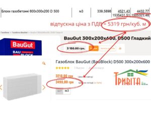 Газобетонные блоки D500 размером 600х300х200 включили в смету по 5319 грн/куб. м. Интернет-магазин «Киевстрой» продает такие блоки по 3150 грн/куб. м, что на 41% дешевле, а «Компания Тривита» предлагает их по 126 грн/шт. Один блок имеет объем 0,036 куб. м, следовательно, один кубометр газоблоков от «Компания Тривита» стоит 3490 грн/куб. м, что на 34% дешевле.