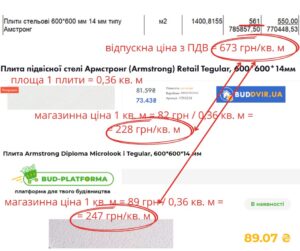 Потолочные плиты Амстронг размером 600х600 мм толщиной 14 мм учли по 673 грн/кв. м. Интернет-магазин «БудДвир» продает такие плиты по 82 грн/шт. Площадь плиты составляет 0,36 кв. м. Следовательно, в пересчете рыночная цена плиты составляет 228 грн./кв. м, что втрое дешевле. Компания «Bud-Platforma» предлагает их по 89 грн/шт., то есть по 247 грн/кв. м, что на 63% дешевле.