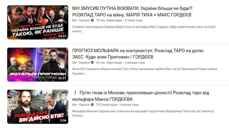 К примеру, на ютуб-канале «Фактов» ICTV преподают «Утро в большом городе». И регулярный гость утреннего шоу — «таролог» Макс Гордеев, победитель литовской «Битвы экстрасенсов», имеющий постоянную рубрику «Спроси таролога». В сентябре он четыре минуты рассказывал, жив ли Пригожин (нет, говорит Гордеев) и когда закончится война (трудно сказать).