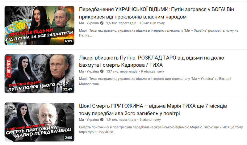 На ютуб-канале «Мы — Украина», также вовлеченном в производство «Единого марафона», от «тарологов» и «ведьм» темнеет в глазах. Здесь «черная ведьма» Ирина Домбровская думает о судьбе Крымского моста. А здесь «астролог» Лариса Даугер предполагает скорую победу Украины. На канале «Мы — Украина» даже есть непревзойденный дуэт Гордеева и Тихой для тех, кому отдельных прогнозов от этих очень востребованных персонажей не хватает. Для этого двойного выступления на канале придумали отдельный жанр – «эфир-спиритический сеанс».