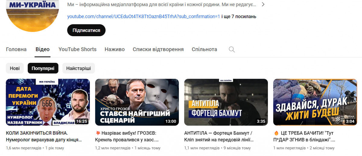 Собственно, видео с наибольшим количеством просмотров на канале "Мы – Украина" – это годичной давности интервью Олега Панюты и Людмилы Добровольской с "мастером нумерологии", участником "Битвы экстрасенсов" Владиславом Грицаем. У видео 1,6 миллиона просмотров. Реальность, так сказать, которой мы заслуживаем.