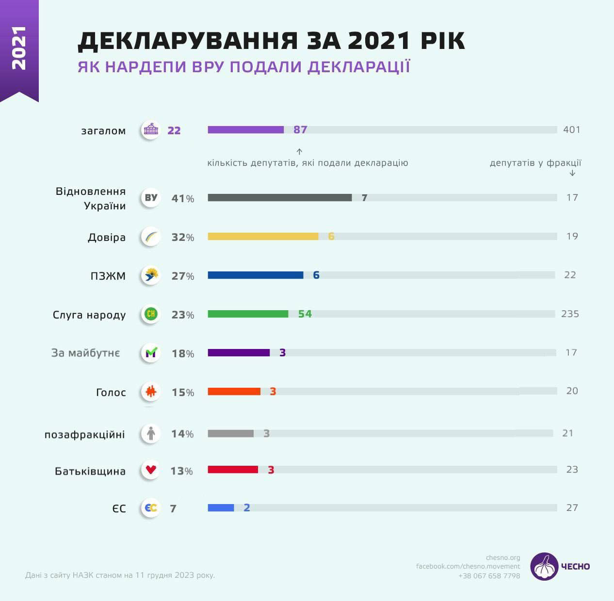 За 2021 год подали свои декларации только 22% нардепов. При этом до 31 января 2024-го все депутаты и должностные лица должны внести ежегодные отчеты за 2021 и 2022 годы.