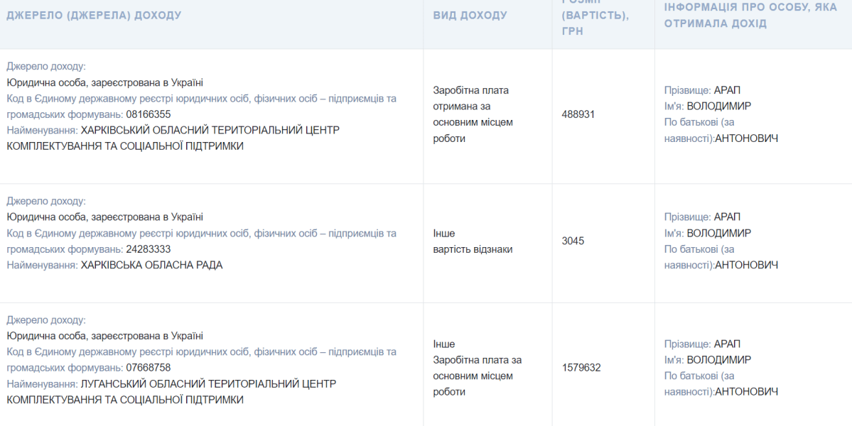 Бывший глава Харьковского ОТЦК и СП Владимир Арап, которого в июле 2023 года перевели на должность главы Луганского областного ТЦК, тоже сумел заработать во время полномасштабного вторжения. К его доходам у правоохранителей вопросов не было. Но, судя по декларации, за короткий период на новой работе Арап получил 1,6 млн грн. В Харькове на том же посту 2022 года он заработал 740,5 тыс. грн. А годом ранее – 488,9 тыс. грн.