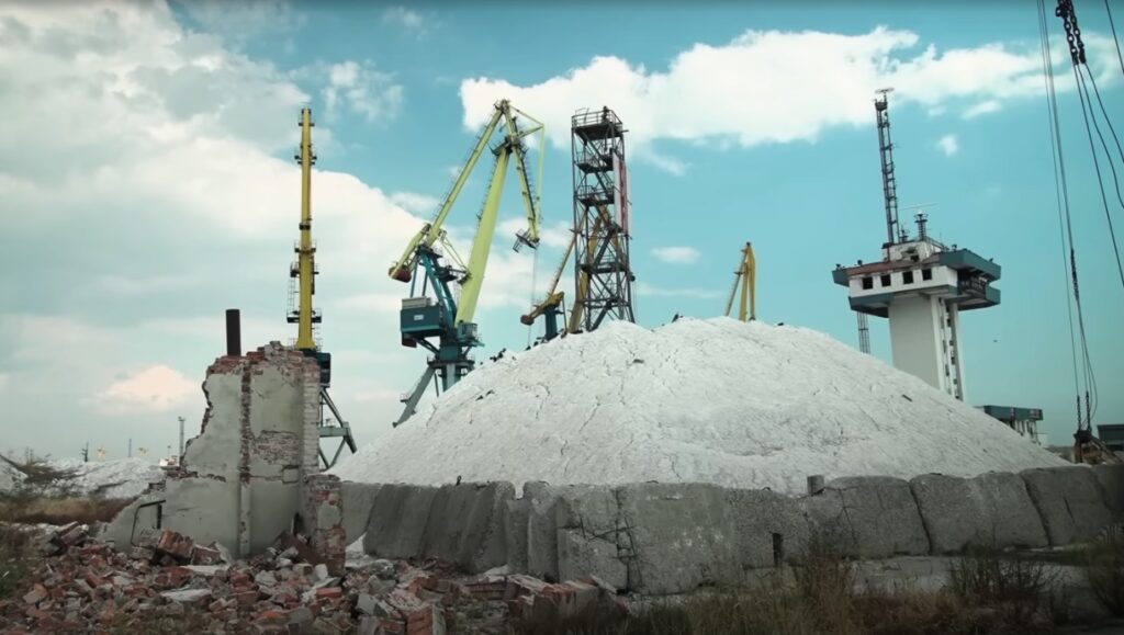 Площадка для хранения каолина в порту Мариуполь, сентябрь 2023 г. Фото: скриншот из видео российских пропагандистов