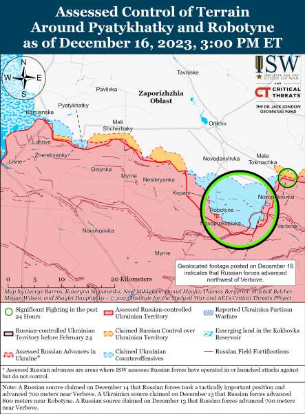 Украинские войска 16 декабря продолжали контрнаступательные действия в районе Работино на западе Запорожской области, но ни одного подтвержденного продвижения не совершили.
