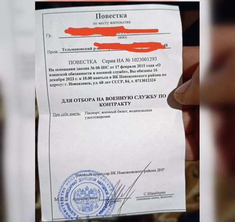 Не менее возмущены местные жители "письмами счастья", которыми называют повестки. Причем сейчас их рассылают массово в разных населённых пунктах на оккупированной территории. Указана и причина: для "отбора на военную службу по контракту". Несмотря на то, что российские власти неоднократно отрицали необходимость новой волны мобилизации, по сути она продолжается с 2022 года. Только теперь как россиян, так и жителей оккупированной территории вынуждают подписывать контракты.