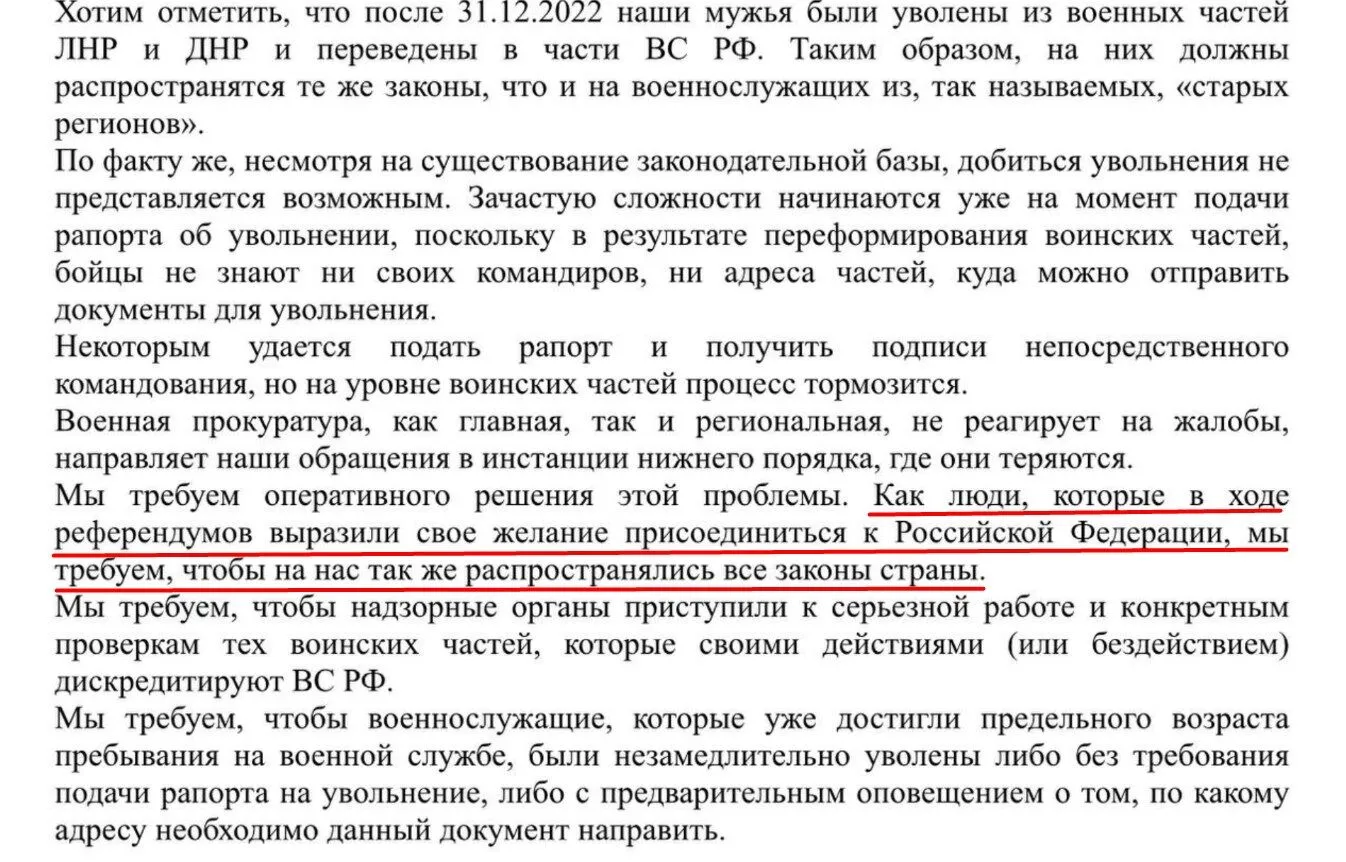 "Как люди, во время референдумов выразившие свое желание присоединиться к Российской Федерации, мы требуем, чтобы на нас также распространялись законы страны", – цинично заявили жены и матери воинов, расписавшись еще и в своей измене.