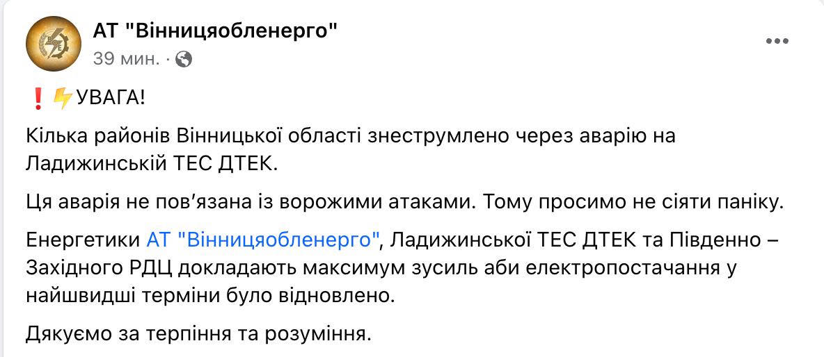 Теги: Ладижинська ТЕСЛадыжинская ТЭСотключения электроэнергиивідключення світлаАварияАваріяВинницкая областьВінницька область