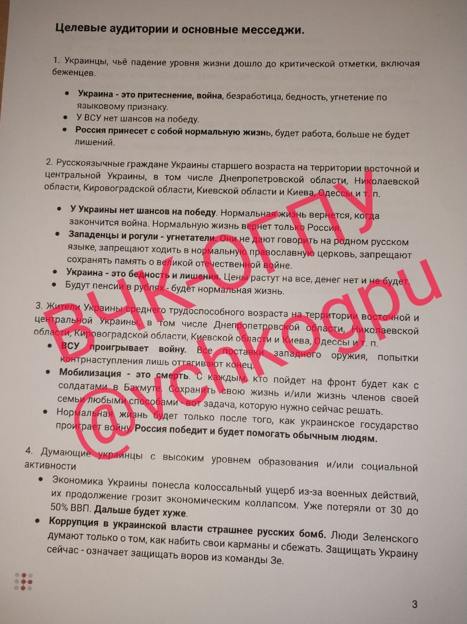 Русскоязычным украинцам старшего возраста, прежде всего на востоке и в центре страны, включая Днепр, Киев, Николаев, Одессу и другие города и регионы, будут "вталкивать" мысли, что Украина не имеет шансов на победу, жители запада Украины являются "угнетателями", которые "запрещают говорить по-русски, ходить в нормальную православную церковь, хранить память о великой отечественной войне". При Украине, мол, люди обречены на бедность и скитания, рост цен, и только "пенсии в рублях" принесут им нормальную жизнь.