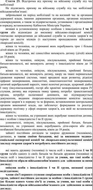 не подлежат призыву на военную службу во время мобилизации в течение двух лет со дня увольнения с военной службы военнообязанные, которые проходили военную службу во время действия правового режима военного положения и были уволены со службы в запас. Такие лица в указанный период могут быть призваны на военную службу по их согласию.