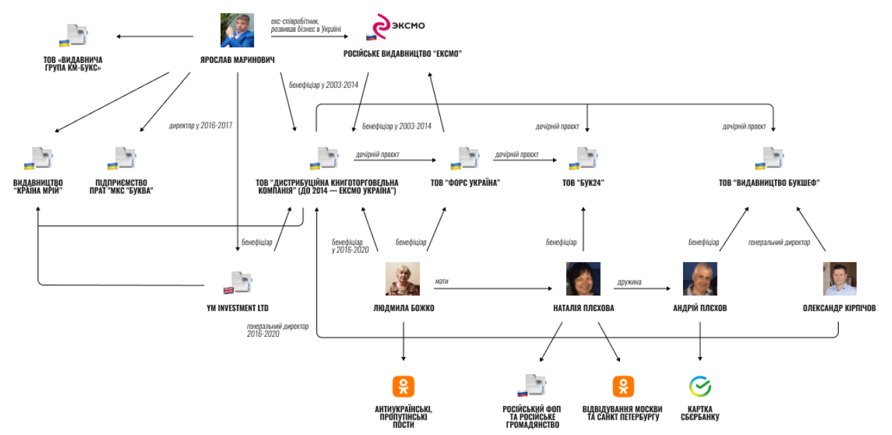 Из совместного исследования «Сенсора» и сообщества «Мольфар» можно предположить, что российское «Эксмо» продолжает присутствовать на украинском книгоиздательском рынке через ряд аффилированных компаний. Похоже, бывшие владельцы украинского филиала «Эксмо» до сих пор опосредованно контролируют сеть проектов, в которых мы последовали связи с Россией и российским «Эксмо» в частности. Оказалось, что у Натальи Плеховой, владелицы одного из этих проектов — book24.ua — даже есть российский паспорт и ФЛП.