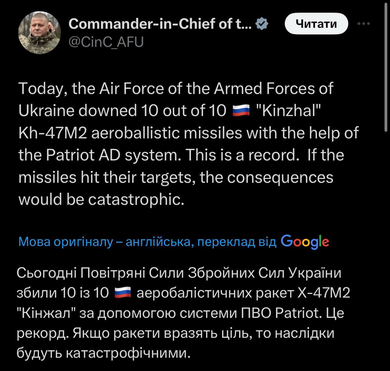 Теги: Напад Росії на УкраїнуРакетные ударыРакетні удариЗСУВСУЗалужный ВалерийЗалужныйВойнаВійнаПВО PatriotPatriotКинжалРакета Кинджал