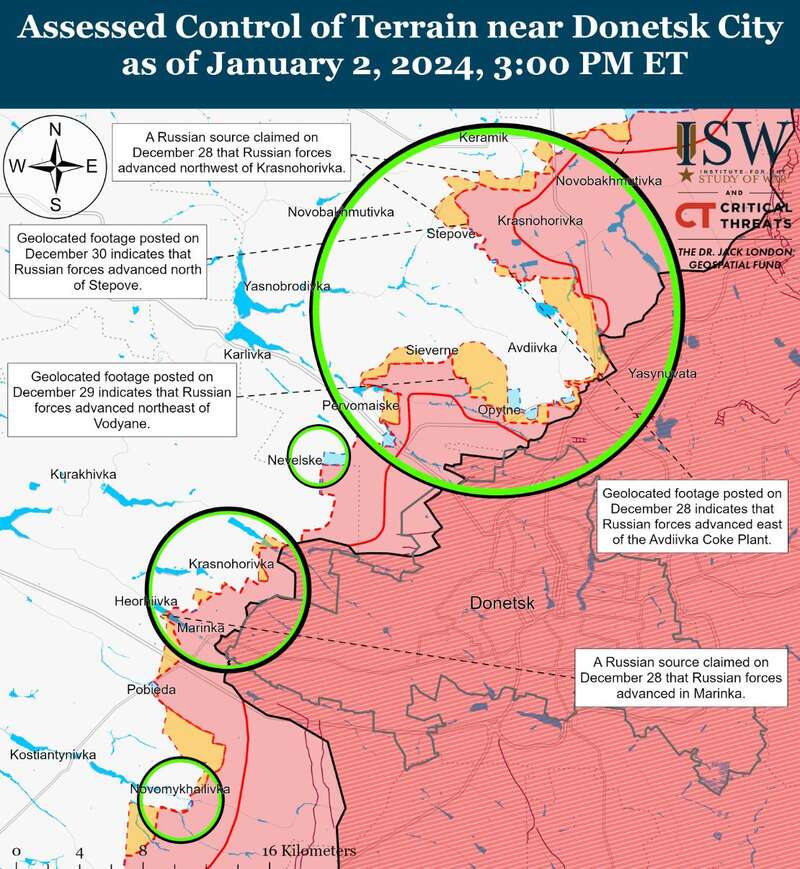 Что же до авдеевского участка, то, как пишет "Институт" в своей утренней сводке, "российские войска недавно совершили подтвержденное наступление к северо-западу от Авдеевки" и продвинулись к северо-западу от Степового.