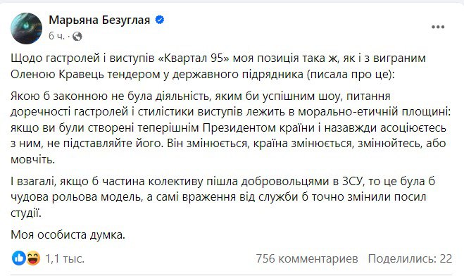 После скандала с номером про Скадовск, нардеп Марьяна Безуглая предложила артистам «95 квартала» пойти добровольцами в ВСУ.