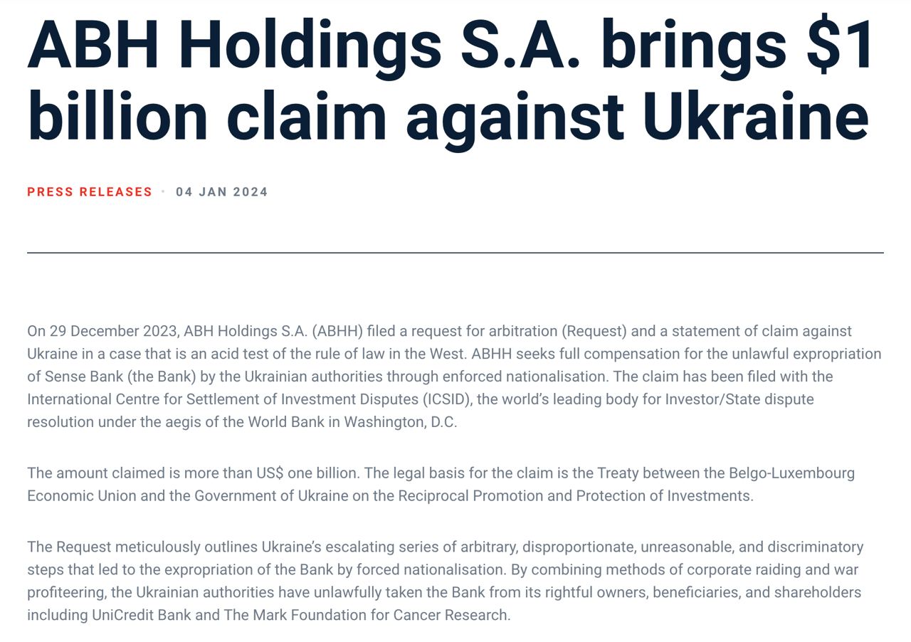ABH Holdings SA требует от Украины полной компенсации за "незаконную экспроприацию" банка путем "принудительной национализации".