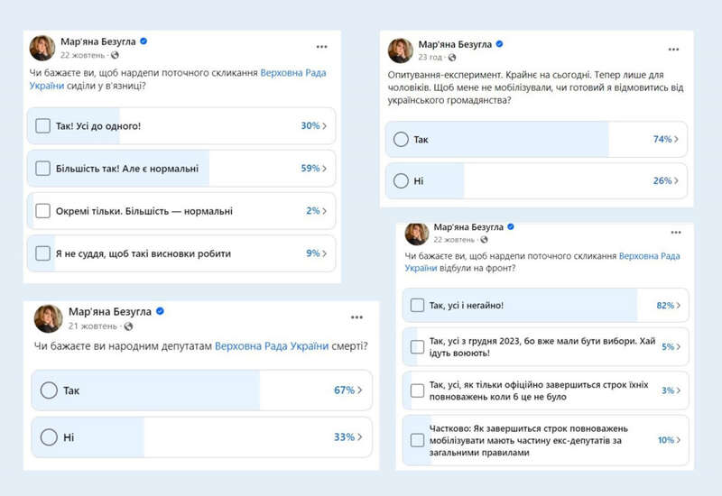Многие опросы с довольно провокационными вопросами потом появляются в российских медиа и Телеграм-каналах. Например, Безуглая спрашивала, желают ли ее подписчики народным депутатам смерти, желают ли люди, чтобы нардепы текущего созыва сидели в тюрьме или чтобы они отбыли на фронт. Также она опрашивала подписчиков, на кого менять Залужного, если искать ему замену, и готовы ли люди отказаться от гражданства, чтобы их не мобилизовали на тыловые должности и оборонные предприятия.
