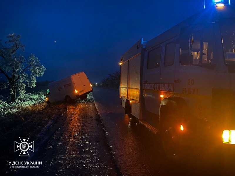 В частности, в Вознесенском районе из-за порывистого ветра на проезжие части попадали деревья, а в городе Новый Буг Баштанского района из-за скользкой дороги автомобиль слетел в кювет.