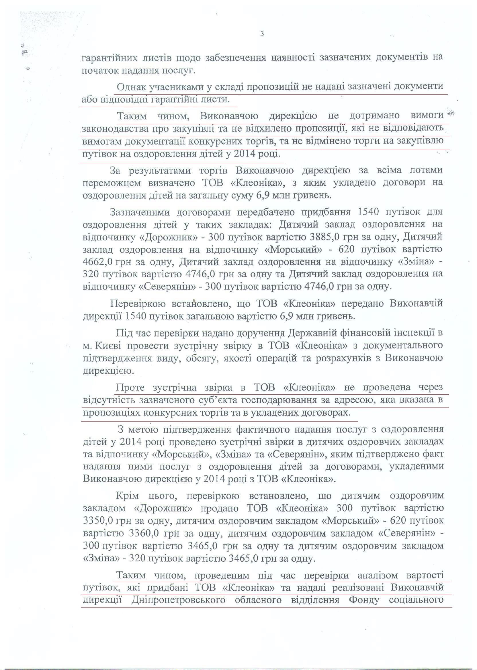 3 апреля это обращение «касательно проведения проверки возможных фактов неправомерных действий должностных лиц исполнительной дирекции Днепропетровского областного отделения Фонда социального страхования по временной потере трудоспособности при закупке услуг по детскому оздоровлению» было спущено из Генеральной прокуратуры на Госфининспекцию. Проверку провели.