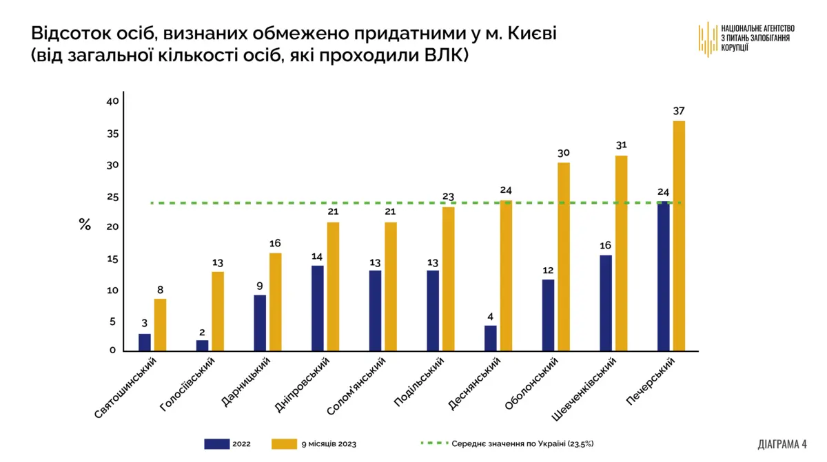 Краткое заключение:. В 2023 году наблюдается значительное превышение среднего значения 23,5% (за период с 2022 по сентябрь 2023 г.) установление ограниченной пригодности лиц к военной службе в Печерском (на 13.5 п.п.), Шевченковском (на 7.5 п.п.) и Оболонском (на 6.5 п.п.) районах г. Киева.
