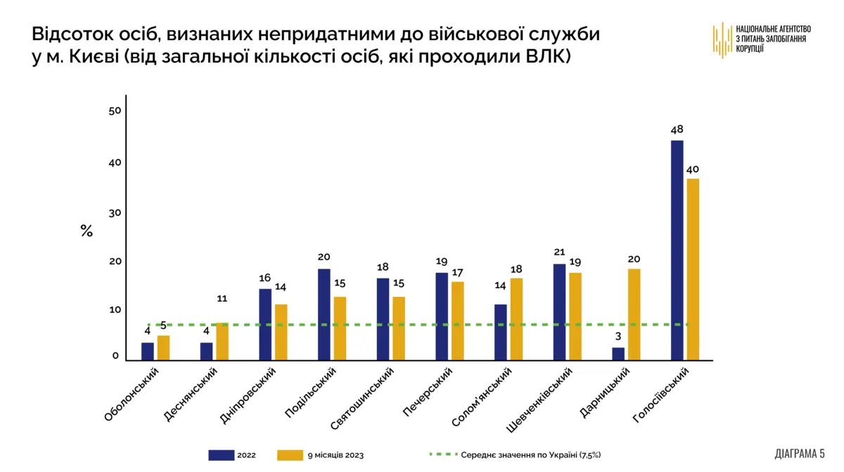 Краткое заключение. В 2022 году наблюдается значительное превышение среднего значения 7,5% (за период с 2022 по сентябрь 2023 г.) установление непригодности лиц к военной службе в Голосеевском (на 40.5 п.п.), Шевченковском (на 13.5 п.п.) и Подольском (на 12.5 п.п.) районах г. Киева. В 2023 году наблюдается значительное превышение указанного среднего значения в Голосеевском (на 32.5 о.п.), Дарницком (на 12.5 о.п.) и Шевченковском (на 11.5 о.п.) районах г. Киева.