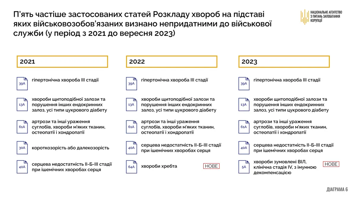 Краткое заключение: Четко прослеживается ежегодная смена одной из топ-5 статей Расписания болезней. В частности, в 2022 году болезни позвоночника (ст. 64а) заменили близорукость или дальнозоркость (ст. 30а), а в 2023 году болезни, обусловленные ВИЧ (ст. 5а), заменили болезни позвоночника. Следует также обратить внимание на то, что в 2022 и 2023 гг. в перечень пяти наиболее часто применяемых статей расписания болезней входят болезни щитовидной железы (ст. 13а), гипертоническая болезнь III стадии (ст. 39а) и сердечная недостаточность II-Б- III стадии при ишемических болезнях сердца (ст. 40а), диагностирование и подтверждение которых сложно и требует проведения значительного количества лабораторных и инструментальных исследований. Указанные болезни также не имеют ярко выраженного внешнего проявления, что позволяет использовать такие диагнозы для коррупционных практик.