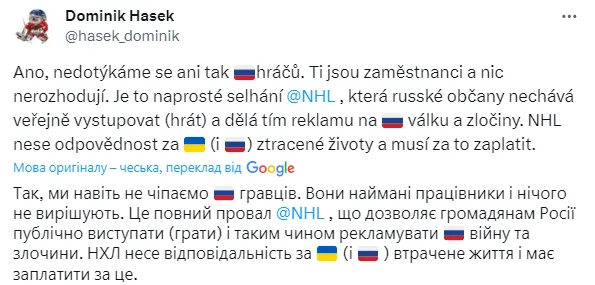 "Да, мы не трогаем российских хоккеистов, потому что они наемные работники и ничего не решают... Это полный провал НХЛ, позволяющий гражданам России публично выступать (играть) и, таким образом, рекламировать войну и преступления. НХЛ несет ответственность за потерянные жизни украинцев (и россиян) и должно заплатить за это", – отметил Гашек.