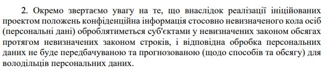 "Обращаем внимание на то, что в результате реализации инициированных проектом положений конфиденциальная информация относительно неопределенного круга лиц (персональные данные) будет обрабатываться субъектами в неопределенных законом объемах в течение неопределенных законом сроков и соответствующая обработка персональных данных не будет предсказуемой и прогнозируемой (по способам и объему) для владельцев персональных данных", – говорится в заключении ГНЭУ.