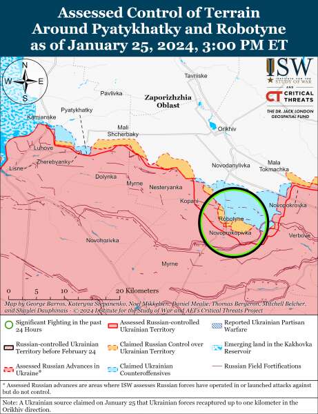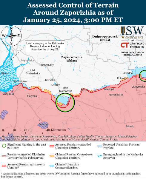 Позиционные бои продолжались 25 января на восточном (левом) берегу Херсонской области возле Крынок, но ни одна из сторон не совершила какого-либо подтвержденного продвижения.