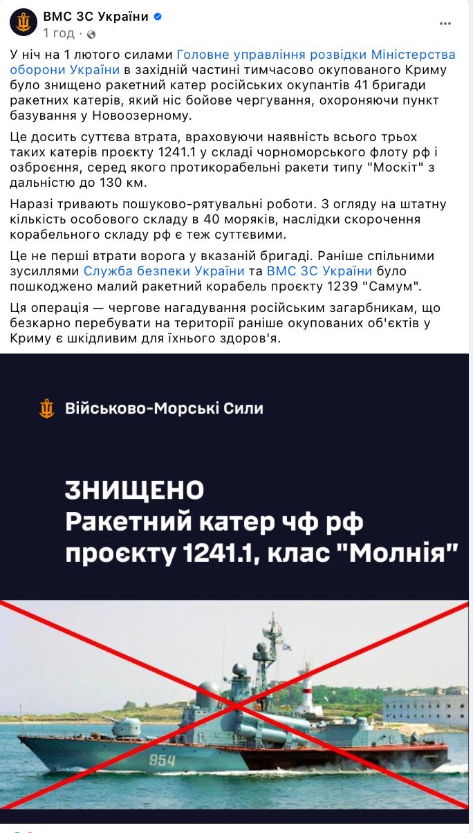 В ночь на 1 февраля бойцы спецподразделения Group 13 Главного управления разведки Минобороны Украины уничтожили ракетный катер "Ивановец" Черноморского флота РФ. С помощью морских дронов было нанесено несколько ударов по кораблю, что привело к его полному уничтожению.