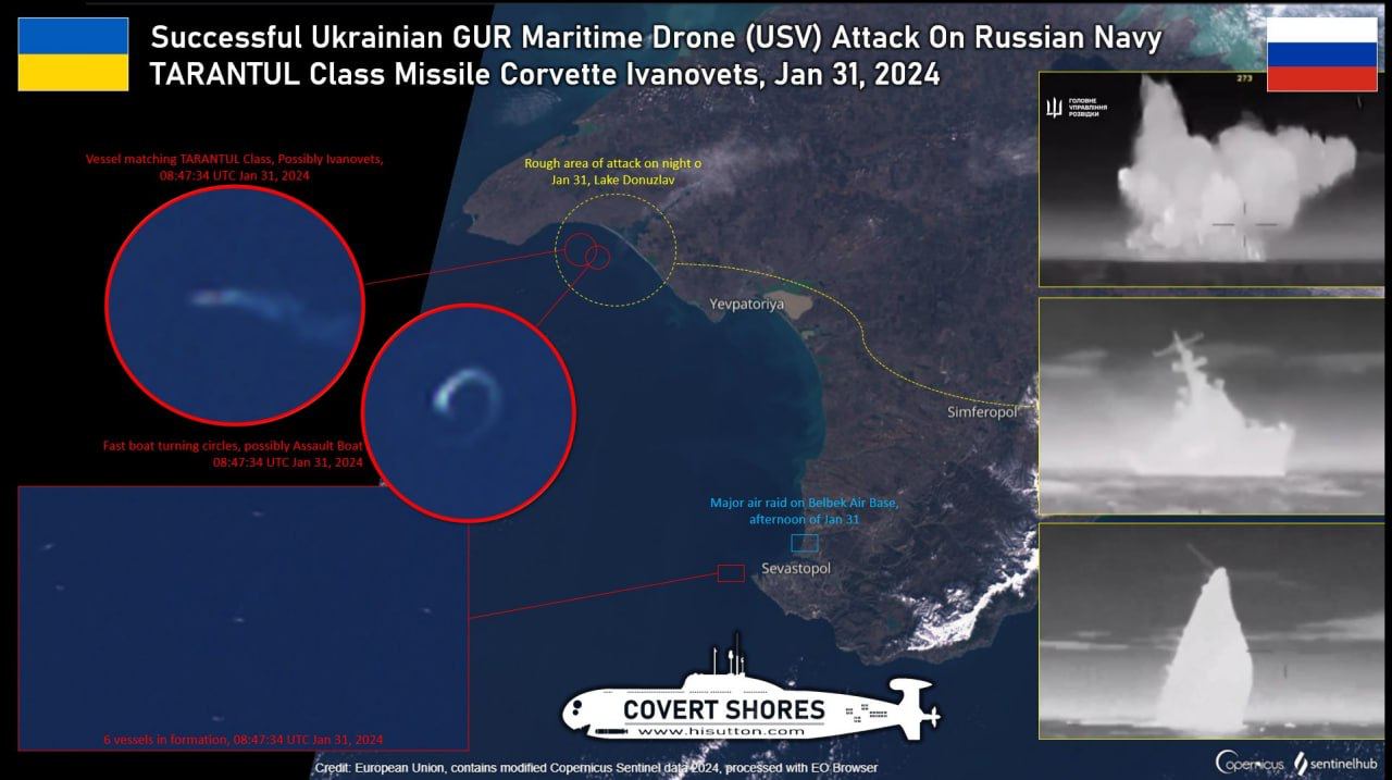 Независимый исследователь HI Sutton опубликовал спутниковое изображение, на котором зафиксирован ракетный катер "Ивановец" на рейде в озере Донузлав. У мыса с ним было еще 6 кораблей. По состоянию на утро 31 января корабль еще был на плаву.