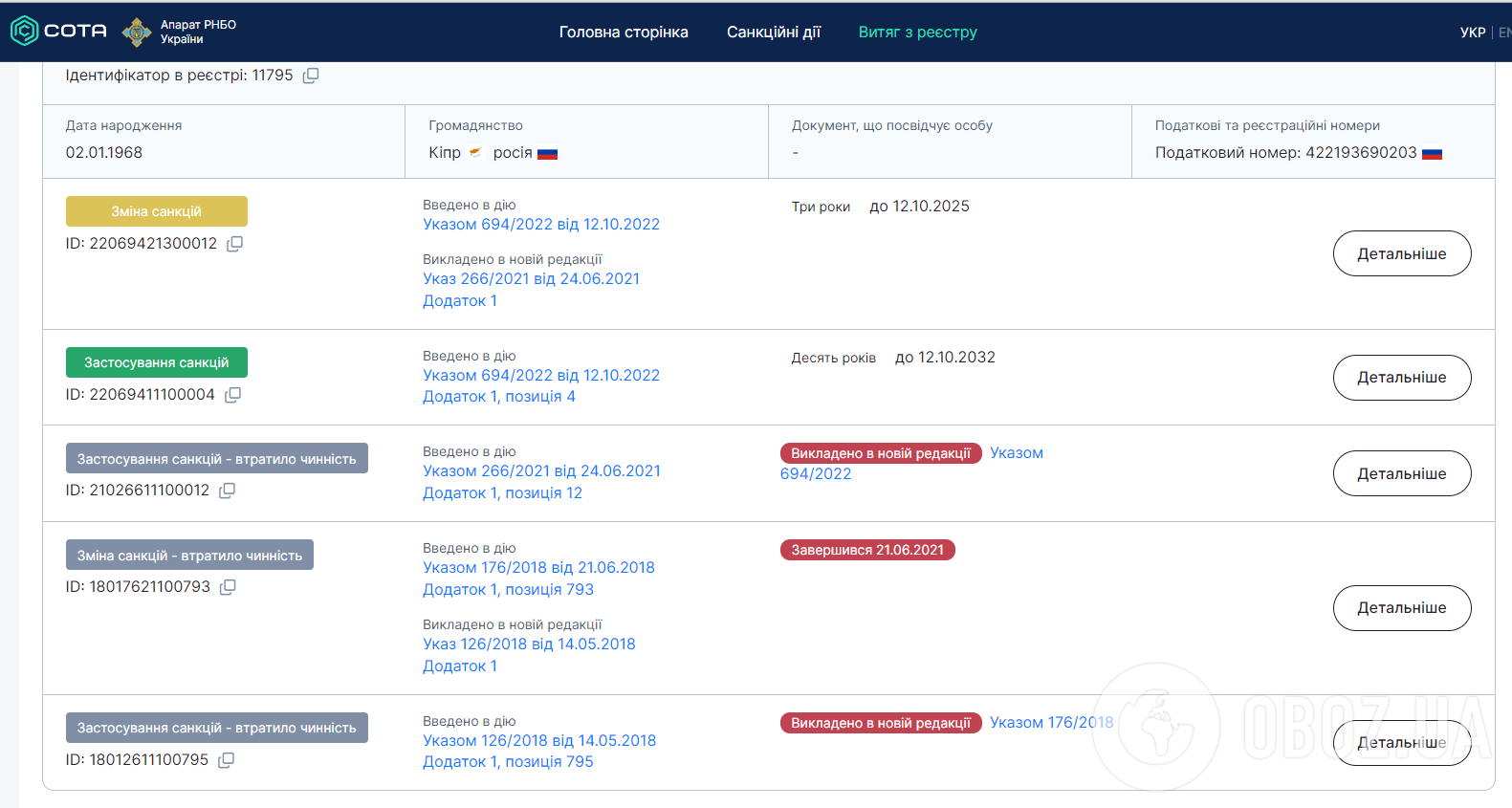 После ввода данных на странице появится информация о статусе подсанкционного лица. Для физлица будет указано, в частности, гражданство и дата рождения, а в некоторых случаях и налоговый номер. Кроме того, в хронологическом порядке будут перечислены все акты о наложении и изменении санкций.