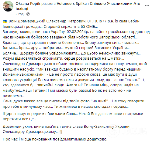 "Кажется, что эти страшные новости бесконечны... Снова погиб сын, муж, отец, брат, друг, побратим, мужественный и верный Защитник Украины... Больно. Каждый раз больно осознавать. К этому невозможно привыкнуть. Ум отказывается воспринимать, сердце разрывается на куски...» – написала она.