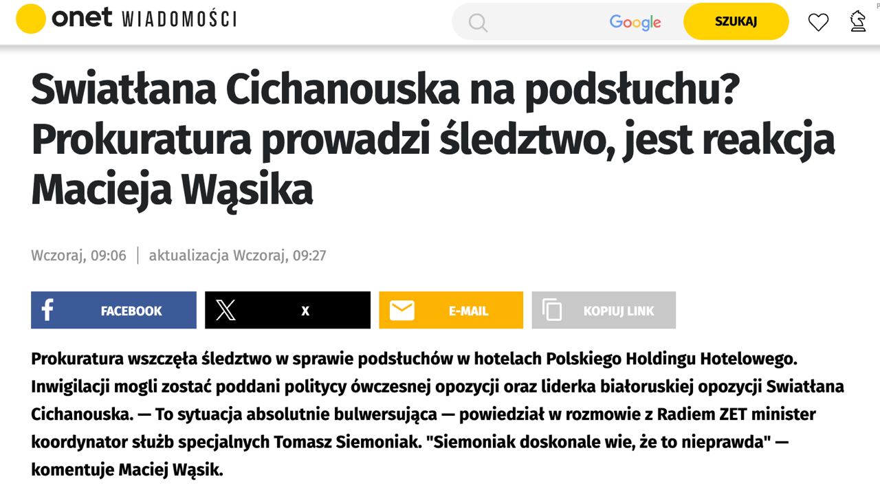 Польское издание Onet сообщает, что спецслужбы Польши вели прослушку лидера белорусской оппозиции Светланы Тихановской в ее отеле. Информацию об этом расследует прокуратура.