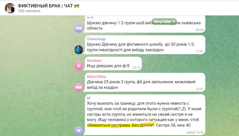 «Обменяюсь сестрами без доплаты», «Ищу женщину с инвалидностью для брака на постоянной основе с помесячной оплатой. До 27 лет», «Имею маму, имеющую группу инвалидности вторую. Расчет после сотрудничества, без каких-либо доплат». Так, в открытых группах Facebook и чатах Telegram ищут фиктивных невест для уклонения от мобилизации.