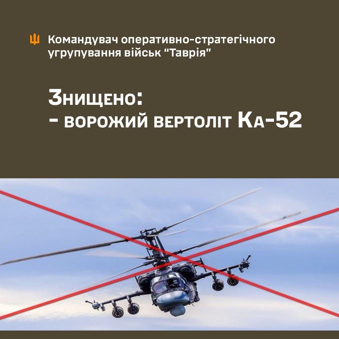 Украинские военные на Таврическом направлении уничтожили вражеский вертолет Ка-52 "Аллигатор"