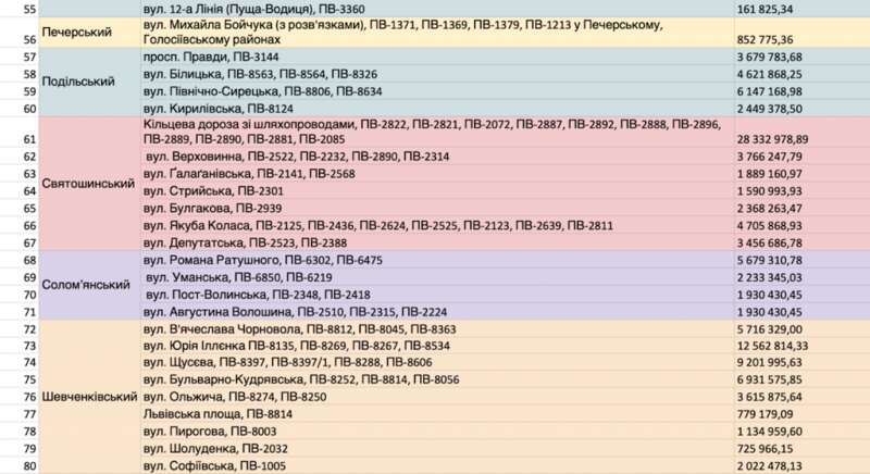 Общая цена договоров составляла 449,7 млн. гривен. Три договора на 10,49 млн гривен разорвали, остальные 80 договоров числятся как исполненные, оплата за фактически выполненные работы по ним составила 421,94 млн гривен.