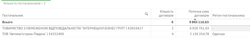 По результатам участия в публичных закупках ООО "Автомагистраль-Юг" заключило 671 договор на общую сумму 167,4 млрд гривен. Крупнейшие заказчики – областные службы восстановления и развития инфраструктуры.