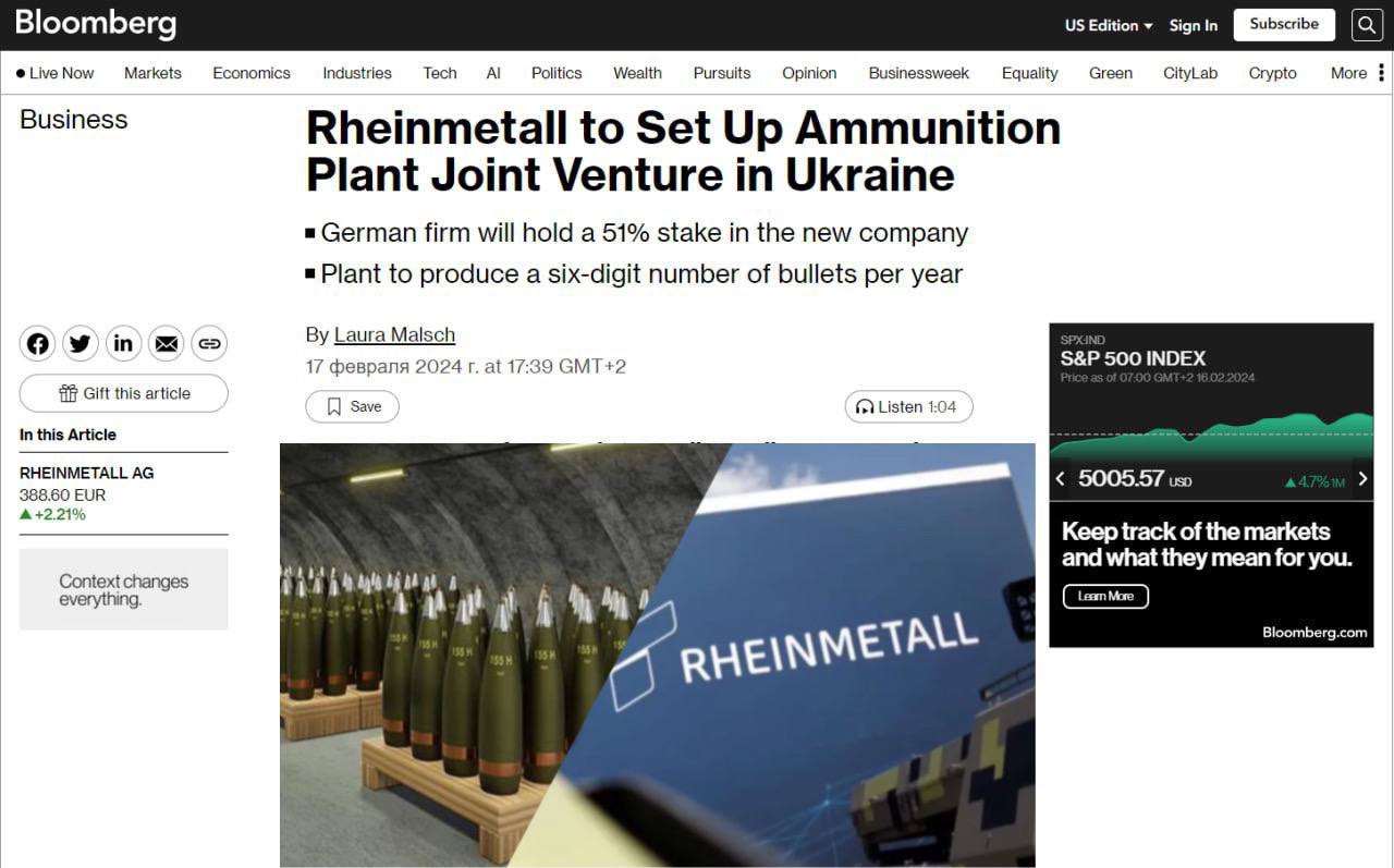 Завод будет производить шестизначное количество снарядов в год. Сроки неизвестны. Напомним, в Украине уже есть совместное предприятие с немецким оборонным концерном Rheinmetall для обслуживания и ремонта техники.